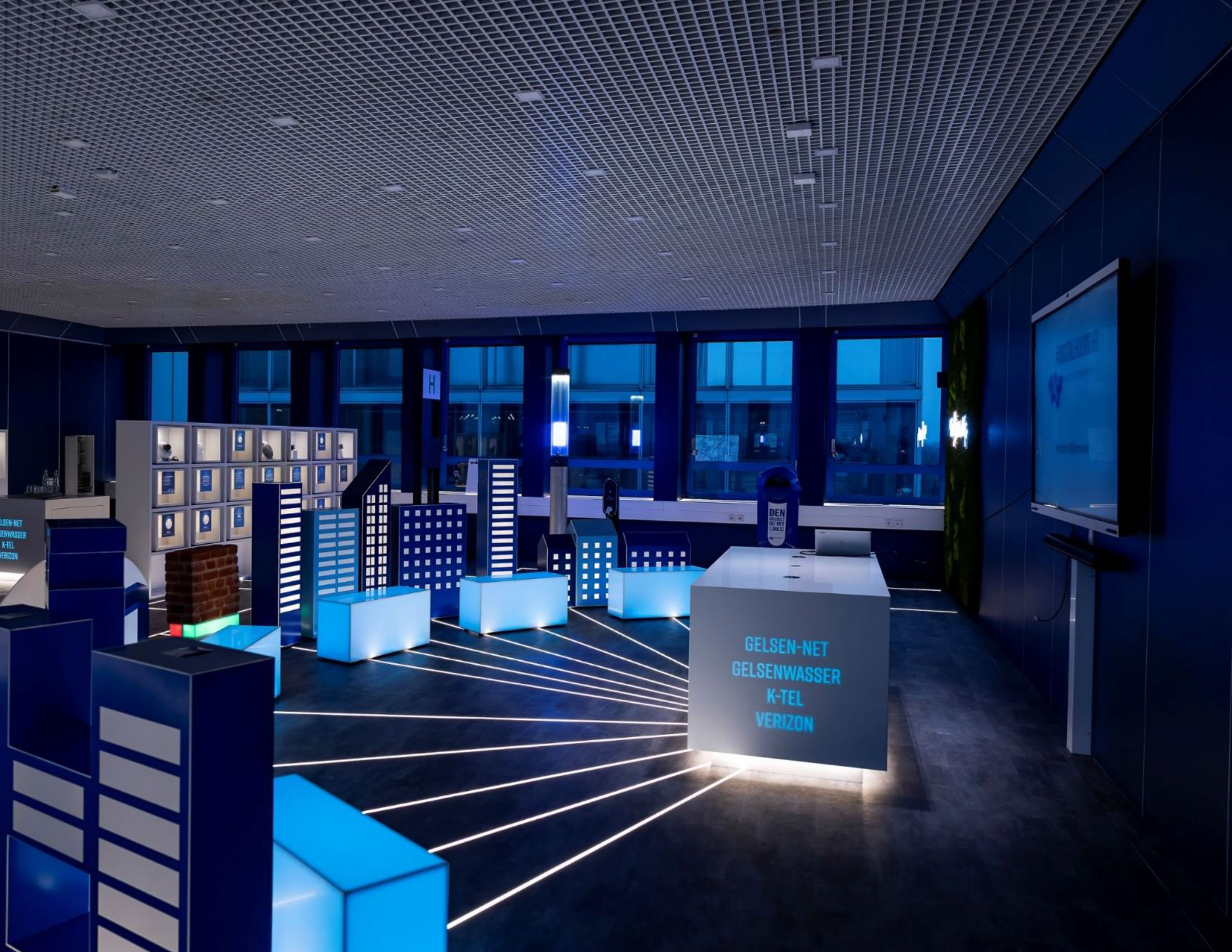 Das Raumkonzept folgt der Logik technischer Schichten. Die erste Ebene zeigt die Netzinfrastruktur – das von GELSEN-NET bereitgestellte Fundament aus Glasfaser, Free WiFi, 5G und LoRaWAN. Die zweite Ebene symbolisiert die Datenplattform (Cloud), wo Datenströme gespeichert und analysiert werden. Die dritte Ebene umfasst die Applikationen: Nutzerfreundliche Systeme für Prozesse wie Smart Traffic, Smart Lighting oder Remote Assistance, die zeigen, wie Daten den Alltag verbessern.