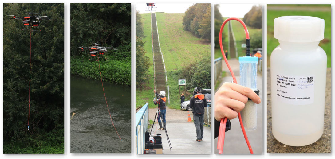 Gemeinsam mit Forschenden der RWTH Aachen testen Emschergenossenschaft und Lippeverband die Entnahme von Wasserproben per Drohne.