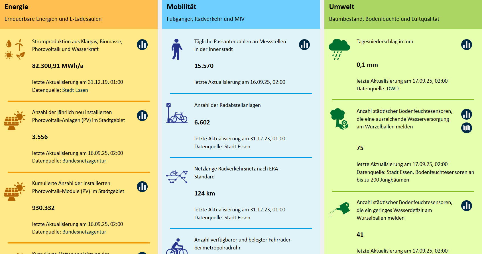 Der neue Service der Stadt Essen bündelt Daten aus unterschiedlichen Themenbereichen der Stadtentwicklung in einer kompakten Übersicht. Der neue Service präsentiert Kennzahlen in Grafiken und Diagrammen, sodass der Smart City-Sachstand auf einen Blick erkennbar ist. Im Bereich Energie wird beispielsweise die Anzahl der jährlich neu installierten Photovoltaik-Anlagen im Stadtgebiet angezeigt – derzeit 3.530 (Stand 08/2025).
