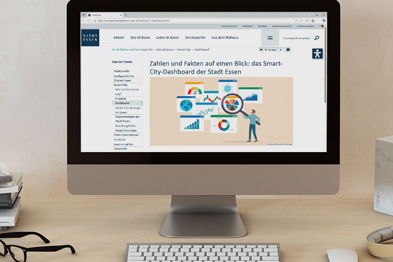 Als eine der zehn größten Städte Deutschlands muss sich auch Essen enormen Herausforderungen stellen, um die Lebensqualität zu verbessern, die wirtschaftliche Attraktivität zu steigern und Nachhaltigkeitsaspekte zu stärken. Mit einer bürgernah, innovationsorientiert und nachhaltig ausgerichteten Smart-City-Strategie für Essen nutzt die Stadt aktiv die Chancen der Digitalisierung für eine zukunftsorientierte integrierte Stadtentwicklung – Teil davon ist das Smart City-Dashboard.